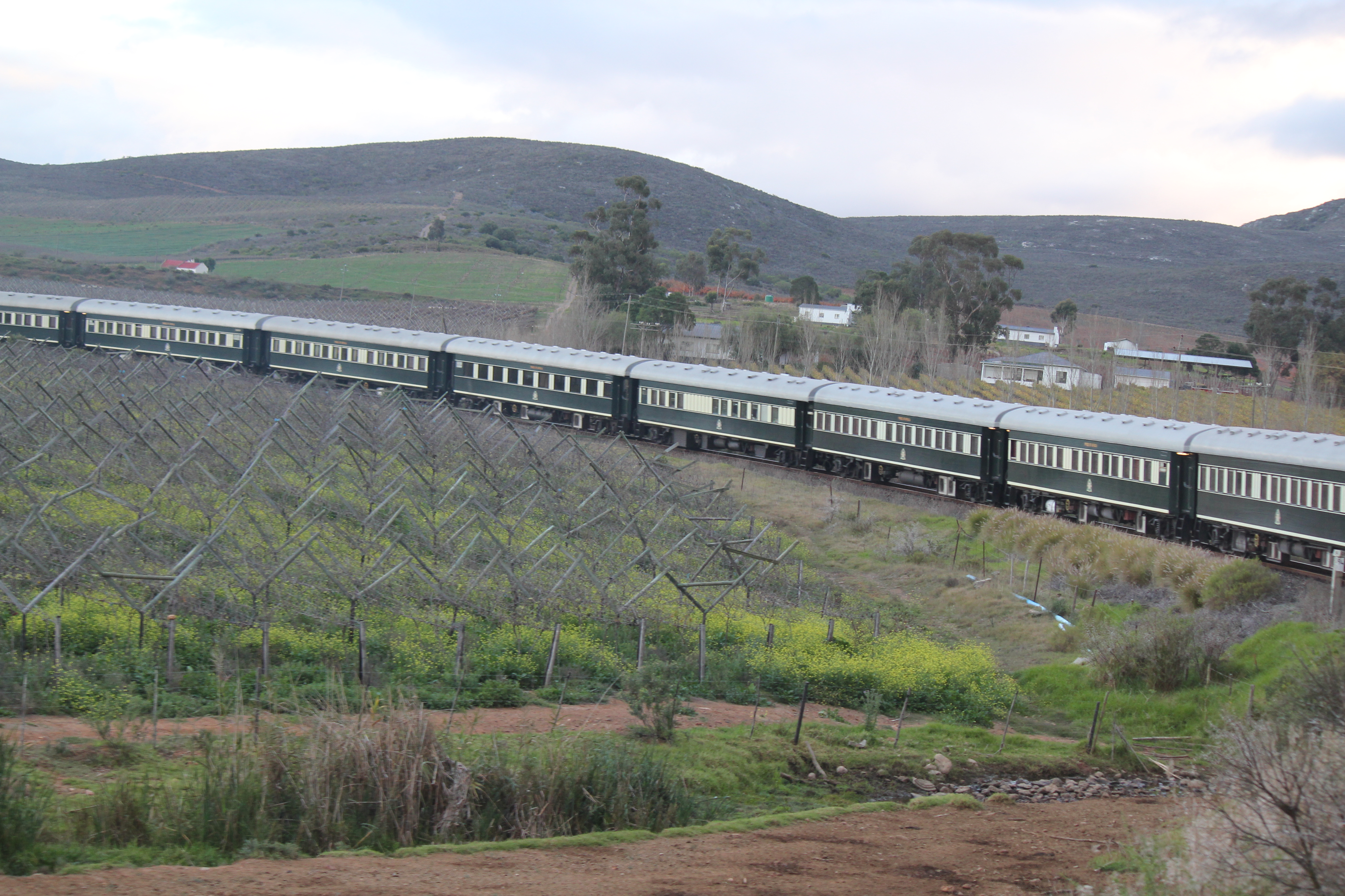The most recent trip was on-board the ROVOS RAIL through South Africa. 9 days filled with no packing and unpacking. Pure joy. It began when we arrived in Pretoria at a charming train station where a violinist played softly and slender glasses of champagne were served despite the unusual time for such things, 9 a.m. The libation sure beat a cup of coffee and was the first indication that we had entered another world where we made the rules and normal time was suspended. It was all so Agatha Christie right down to the requirement that passengers “dress” for dinner which was beautifully served in your choice of one of two wonderfully decorated dining cars with windows as wide as you’d want to take in all the miles of landscape rolling by.