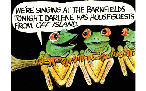 I live in harmony with the tree frogs now. You get used to them after a while. They become just another aspect of the island’s audio landscape~ much like the sound of the waves and the whoosh of the wind.