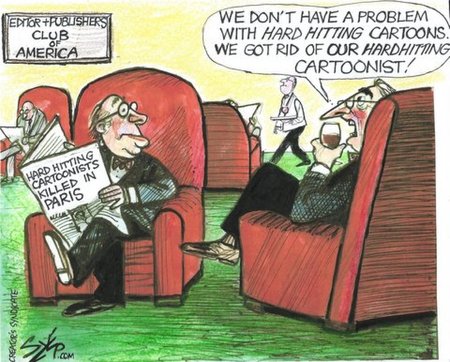 “The Charlie Hebdo tragedy is beyond words,” said Szep when I wrote him. “It does transcend religion. These thugs are just like any extremists. They are just killers that in this case hide under the guise of the Koran. There is no danger of that kind of thing happening right now in this country. Newspapers are so preoccupied with loss of circulation, hard hitting cartoons are a thing of the past. I just have to appreciate what I had and when I had it,” said Szep.