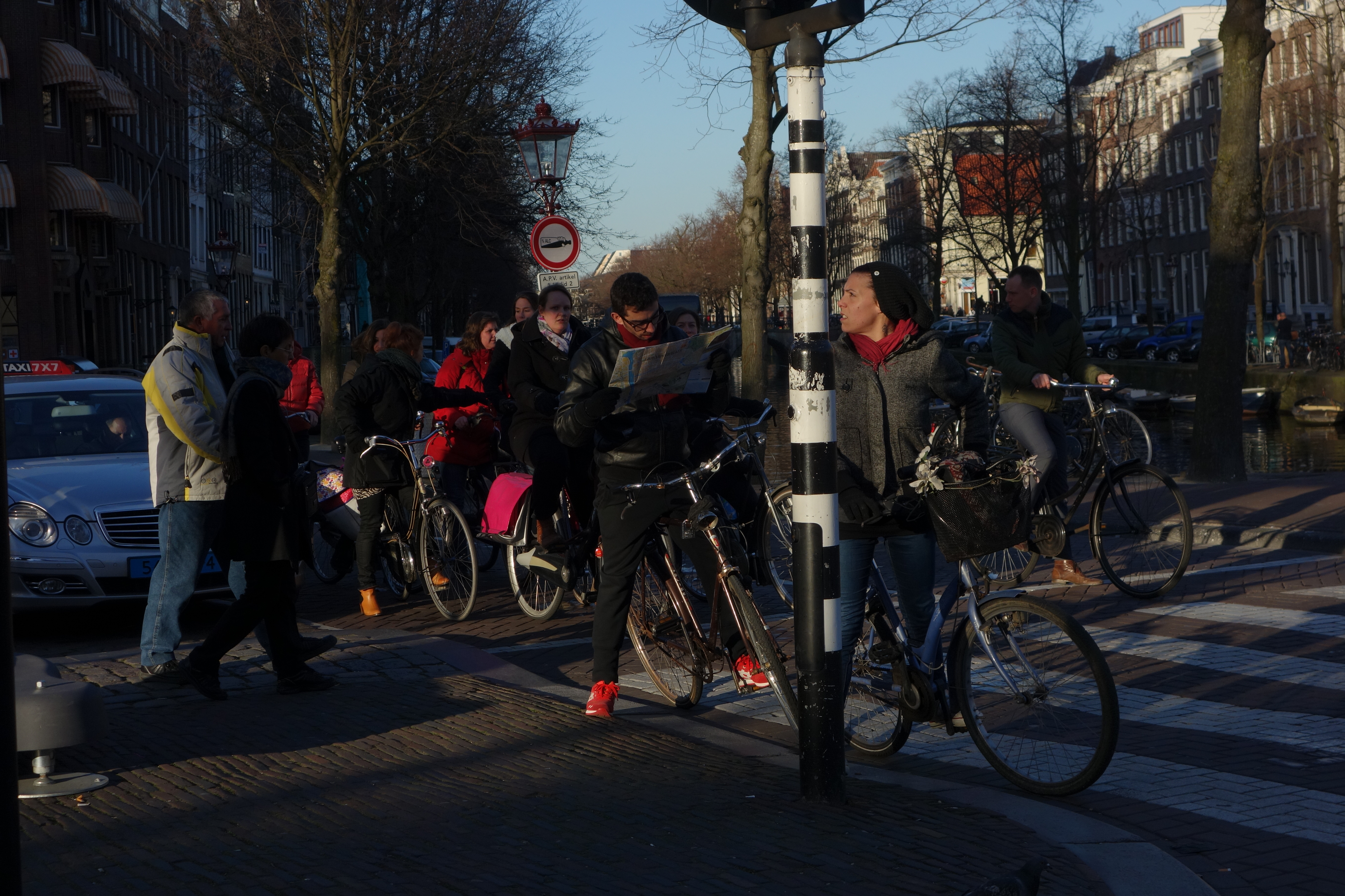 “Be Careful,”was the last thing our cab driver told us as he sped away from our Amsterdam hotel after dropping us there from the airport. His reference did not refer to the pick pockets frequenting the ‘Red Light District’ although he did urge caution there as well. No, he was talking about the death defying perils facing pedestrians. It is a tortuous effort to walk here. You must repeatedly look both ways causing severe neck problems for some I am sure before even attempting to move across a canal or street. Narrow roads, made even smaller with side parking, are choked with automobiles and streetcars. But, most threatening, is a slimmer lane abutting the main one reserved solely for cyclists. It is a terrifying and unrelenting mix of movement. Man versus metal. With cyclists as the alpha dogs.